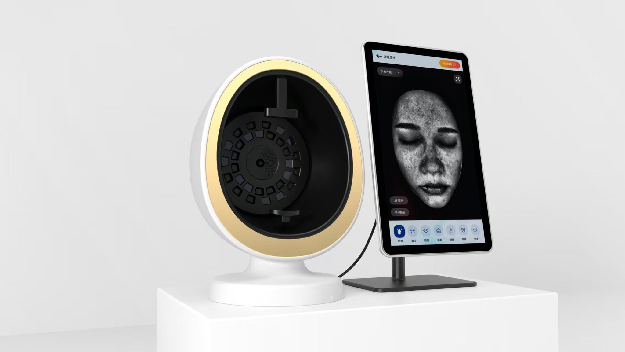 The lens imported from Japan, which has 30 million HD pixels to obtain the image of the facial skin, 8 imaging spectrometry, AI face recognition technology, data analysis and detection, 3D skin simulation technology, cloud computing cloud storage, quantitative analysis of surface and deep pathological characteristics of the skin, detecting 16 kinds of skin health indicators.